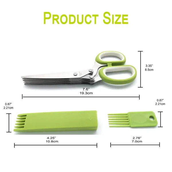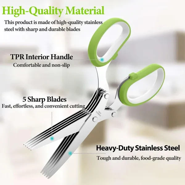 5 Blade Scissors: Multi-blade herb scissors are made of food grade stainless steel, containing 5 sharp blades firmly locked in place with 3 solid rivets. The blades are sharp, durable, and do not rust easily.
